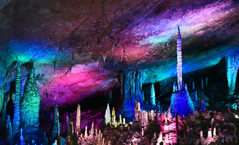 張家界武陵源的黃龍洞,號(hào)稱世界溶洞奇觀,今年九月份,我懷著探秘的心境前來(lái)欣賞。洞內(nèi),頭一段路較為平坦,約百米,漸漸踏上了石階,燈光灰暗,眼前的一切都顯得模糊,導(dǎo)游小邱說洞中有幾層,展現(xiàn)在眼前的是一個(gè)豪華的“歌舞廳”,我想那龍王和他的子孫們?cè)谥匾墓?jié)日定然在這舞廳展示風(fēng)采吧!殿堂里燈光不停的閃爍,色彩斑闌,隱隱約約看見它的小女兒正在與情人約會(huì),手牽手低低切切,情意綿綿……這個(gè)大廳名曰:“龍舞廳”,之外,還有天堂宮、天仙宮、后宮、龍宮……
